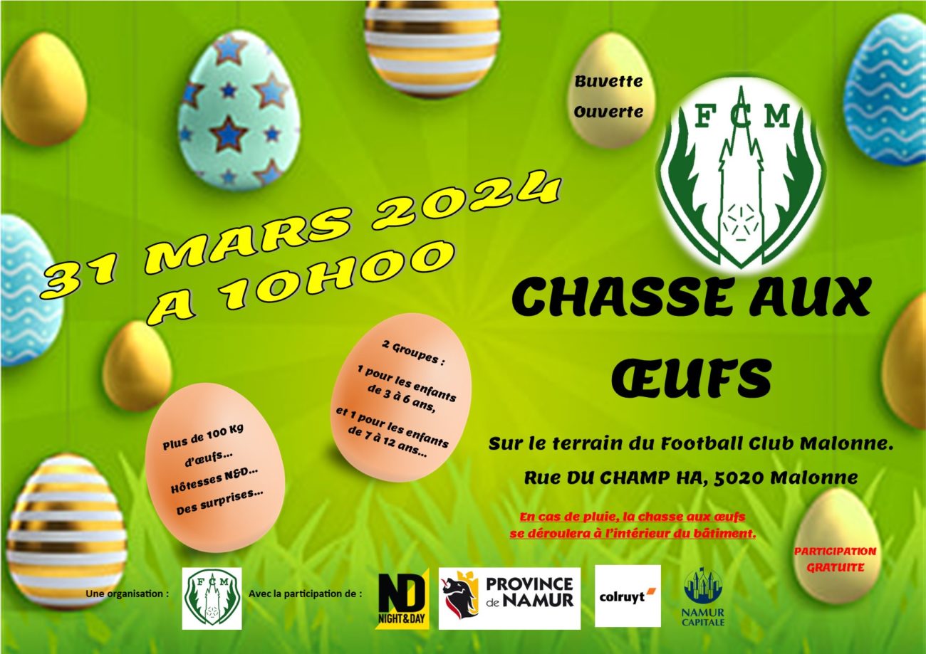 Chasse aux Oeufs… 22 mars 2024Archives du club , Evènements Le Fc Malonne vous invite à sa traditionnelle chasse aux oeufs. Et en plus elle est gratuite... ;-)